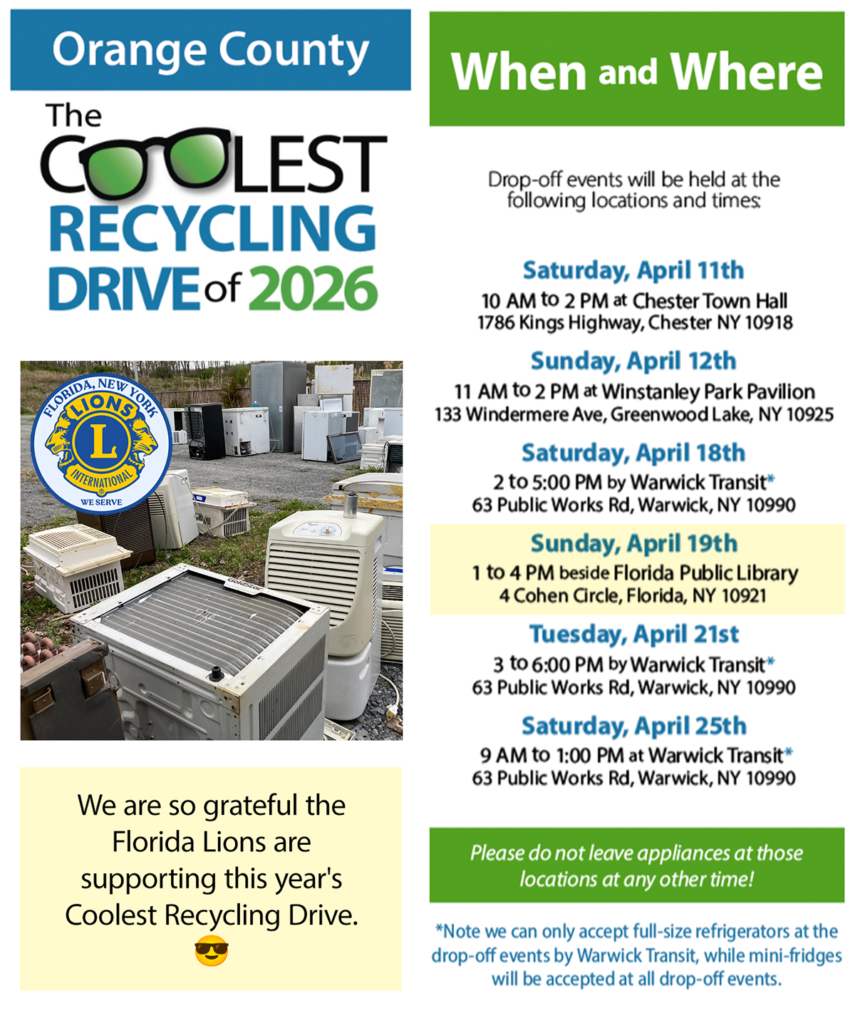 Helping declutter homes while keeping the earth cool! The drive is co-sponsored by the Town of Warwick’s Climate Smart Communities task force and is open to all residents of Orange County.
