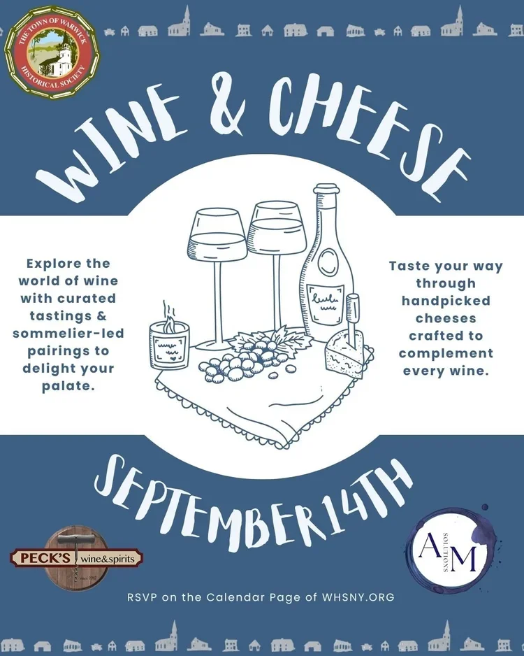 Renowned wine educator Amanda Marsh O’Rourke will once again lead guests through an exceptional pairing of unique wines and artisanal cheeses, thoughtfully selected for an unforgettable tasting experience. Featured wines, provided by event sponsor Peck’s Wine & Spirits, will be available for purchase—with $3 from every bottle sold benefiting the Warwick Historical Society.