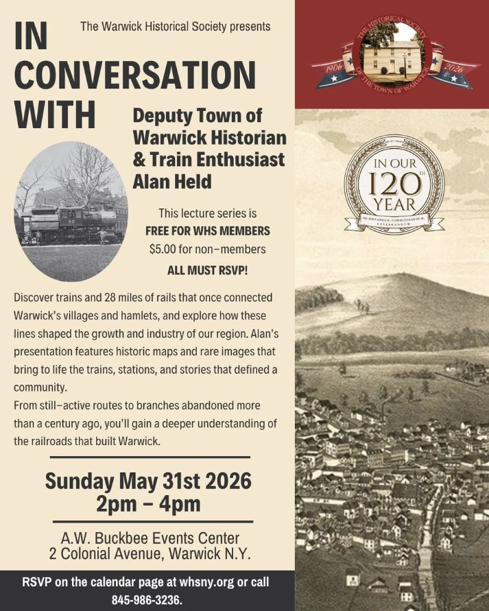 A part of our "In Conversation With" series, Alan's engaging presentation will explore the 28 miles of railroad lines that once connected Warwick’s villages and hamlets, shaping the region’s growth, commerce, and daily life. Through a richly illustrated talk featuring historic maps, rare photographs, and compelling then-and-now comparisons, attendees will gain a vivid understanding of the trains, stations, and stories that defined the community.